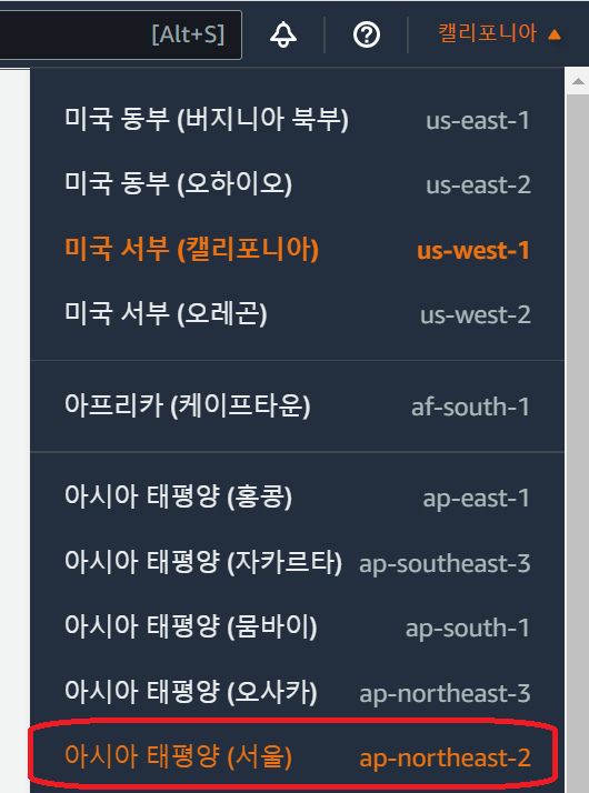 ※이때 혹시 우측 확인 결과 리전이 서울이 아닌경우 클릭하여 서울로 변경해주자.