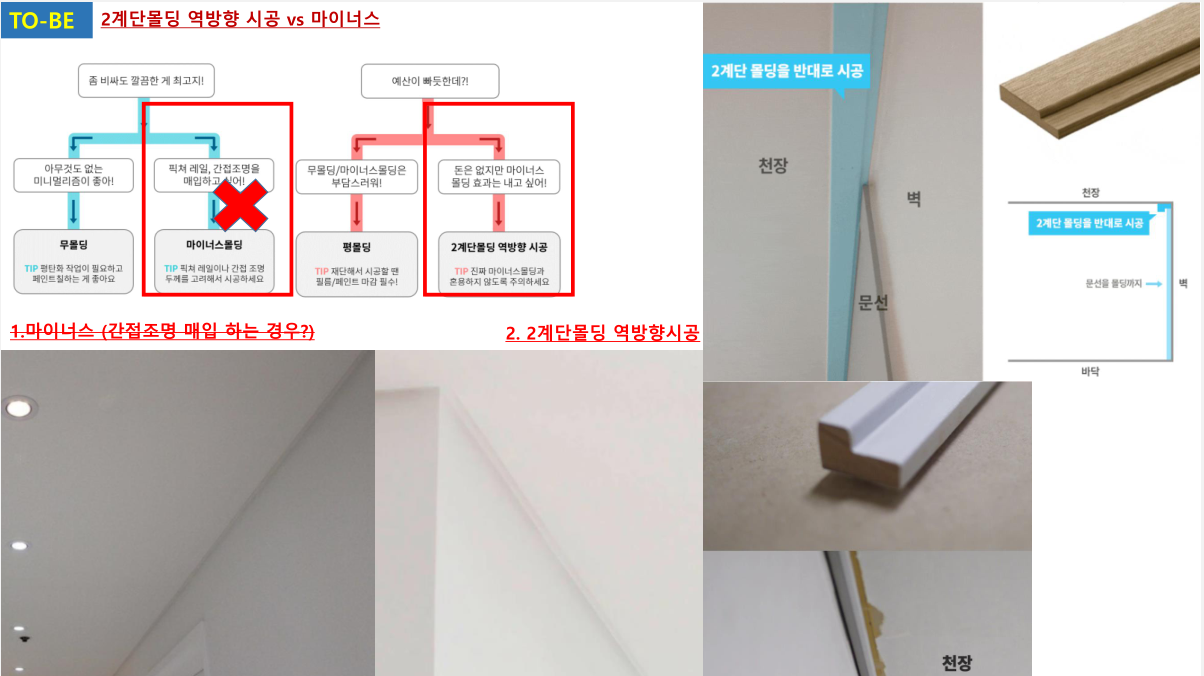 천장 몰딩은 역방향시공 또는 마이너스 몰딩을 계획 하였다. 하단 걸레받이는 너무 길지 않게만 하면 될 것 같다.