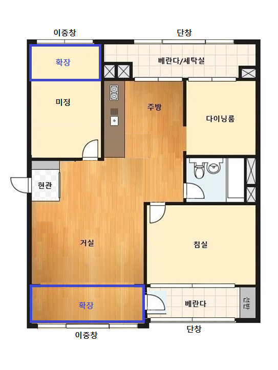 그리고 이 도면을 활용하여, 내가 진행할 내용(거실 확장, 샤시 등등)을 적용한 도면으로 편집 해 보았다.