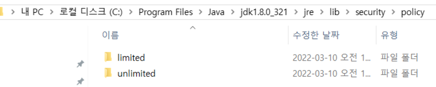 - 반대로 길이를 제한하고 싶다면 java.security 파일에서 crypto.policy를 주석 처리 한다. - JDK 8u151 이상 버전에서는 아래와 같이 두개의 디렉토리로 나뉘어져 있다. %java_home%/jre/lib/security/policy/limited %java_home%/jre/lib/security/policy/unlimited