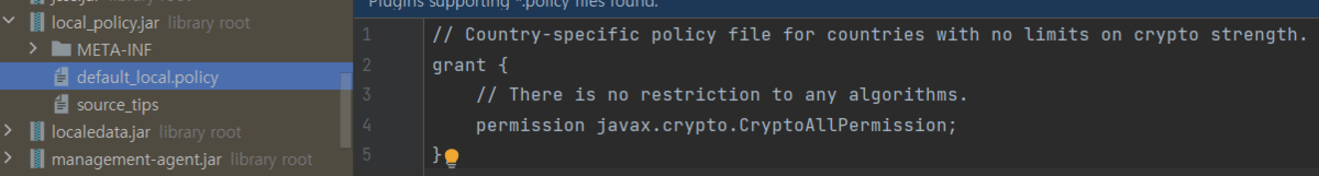 - %java_home%/jre/lib/security/java.security 파일을 열어 하기 부분을 주석 처리하면 정책 제한을 해제할 수 있다. crypto.policy=unlimited