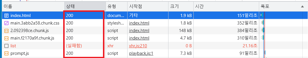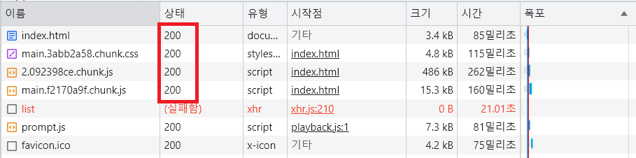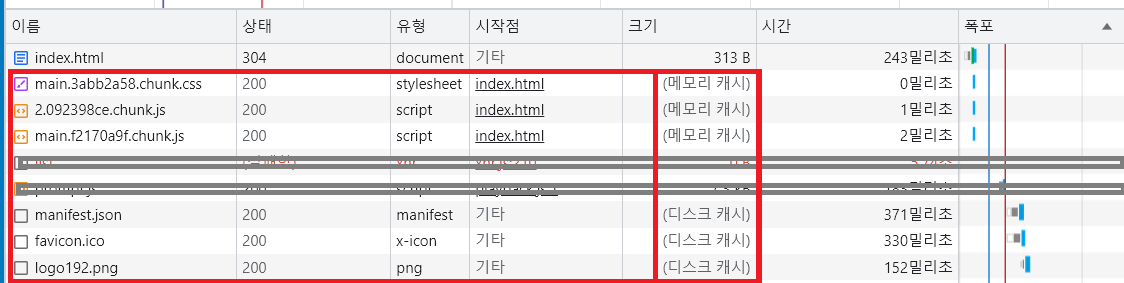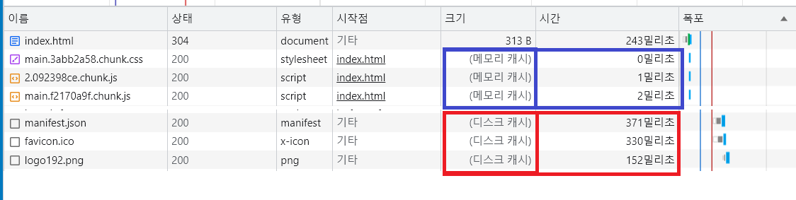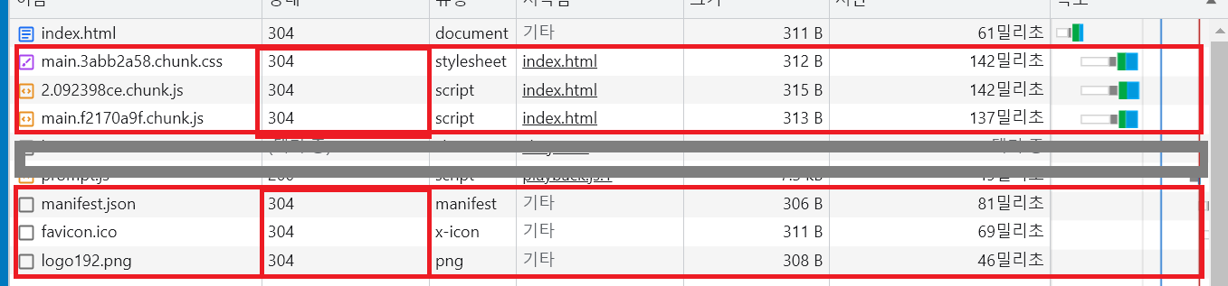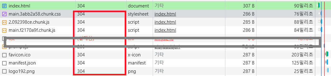 이번엔 모두 304(NotModified) 되는것을 볼 수 있다.
