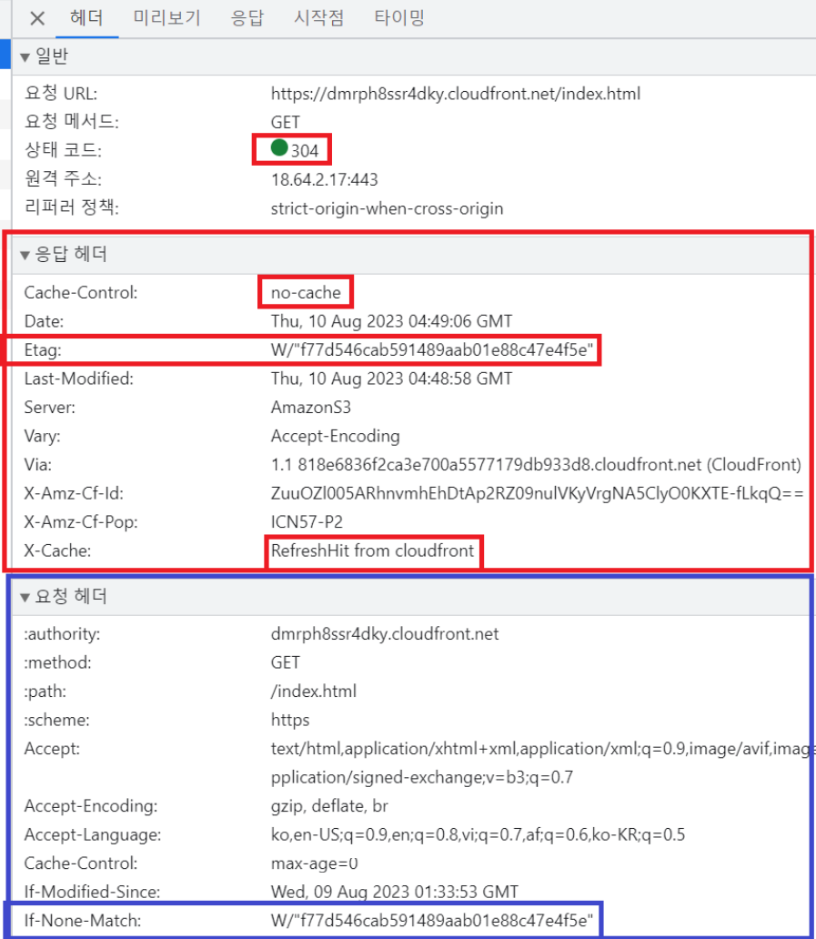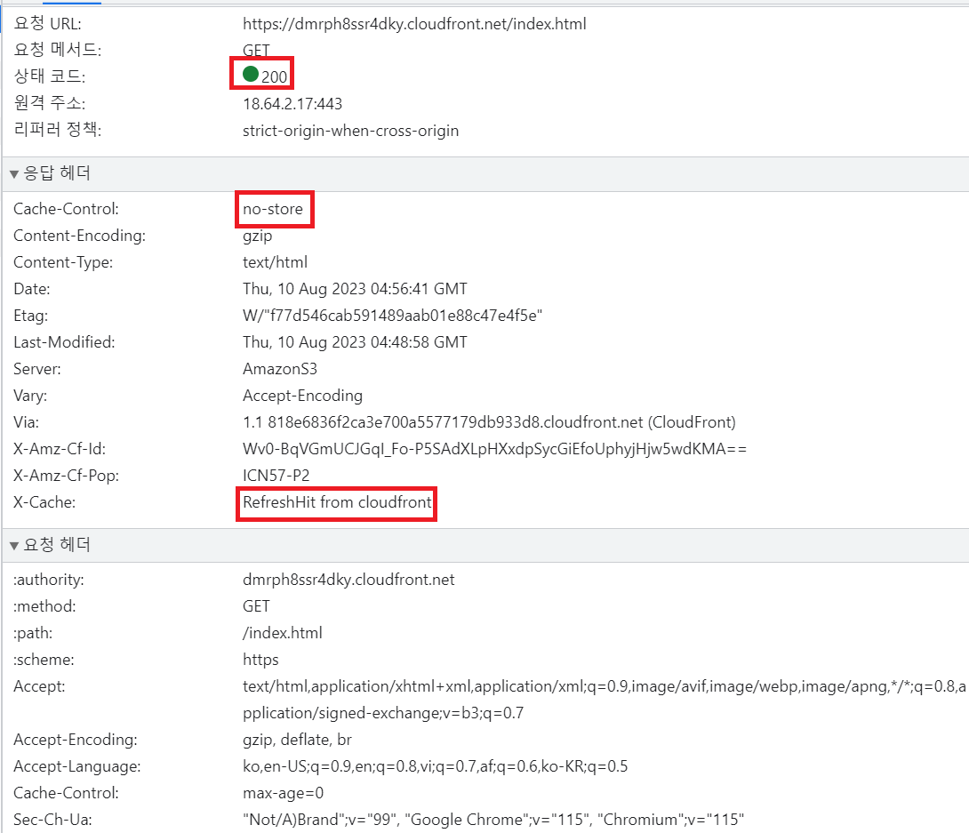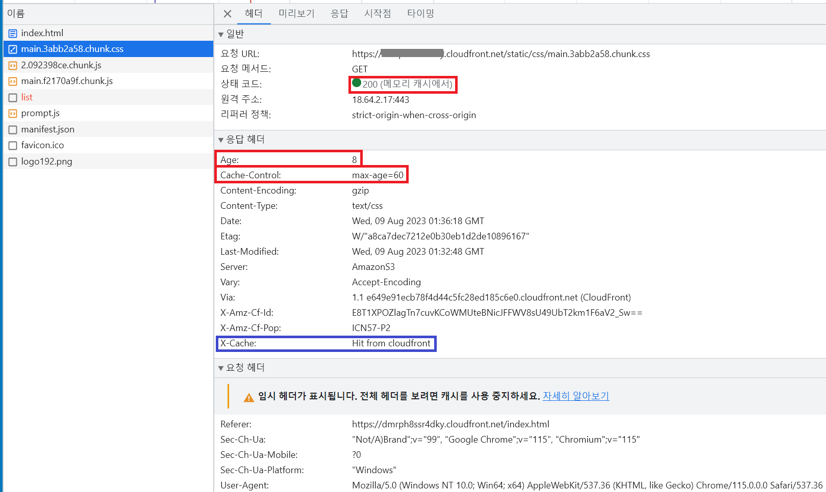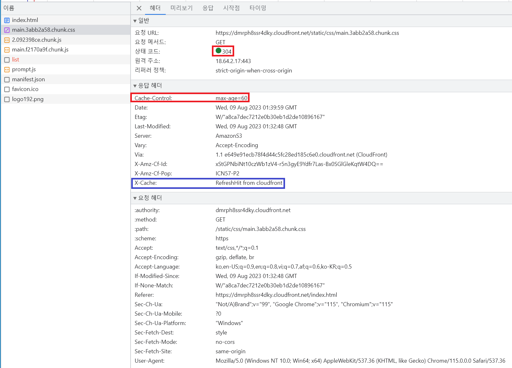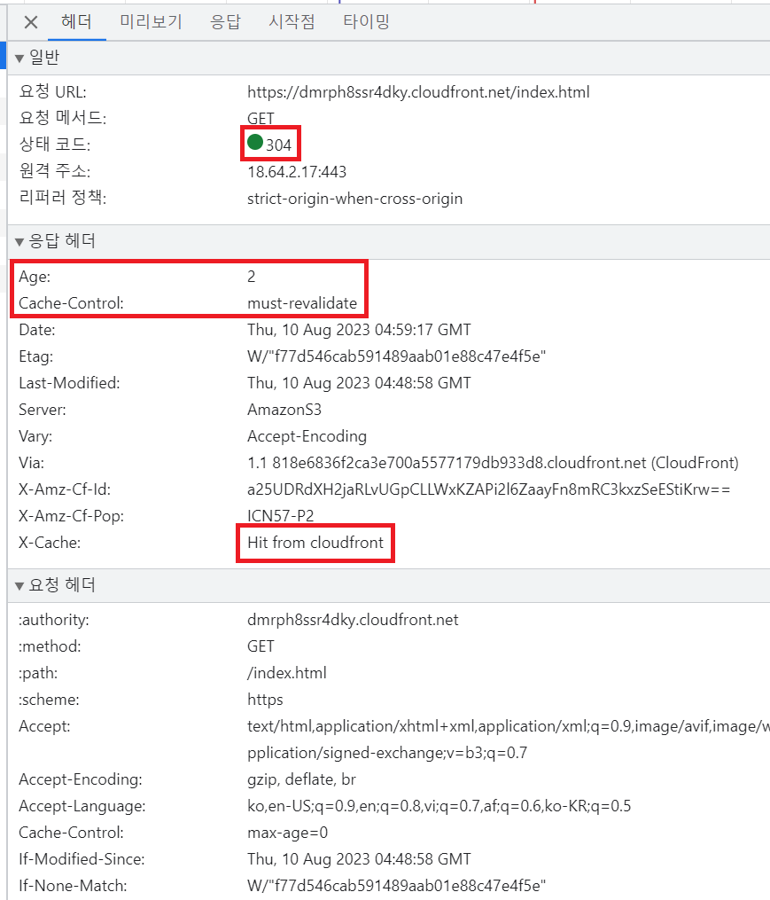 - CDN에서는 60초 동안 캐시되지만 브라우저에서는 매번 재검증 요청을 보내도록 설정 하였다.
