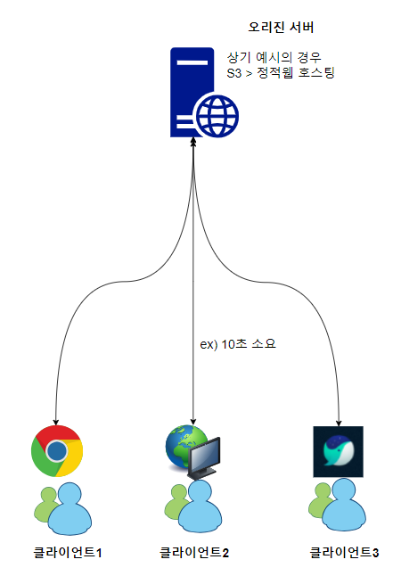 - AWS S3를 통해 정적 웹 사이트 호스팅 하여 해당 서버가 오리진(Origin)서버 이다. (해당 서버는 미국에 있다.)