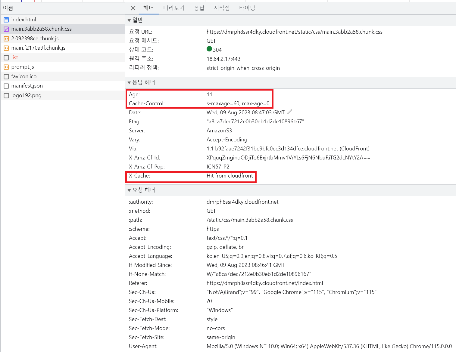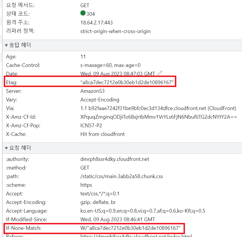 (응답 헤더의 Age: 11로 60초 이내지만, 304로 CDN 확인 처리)