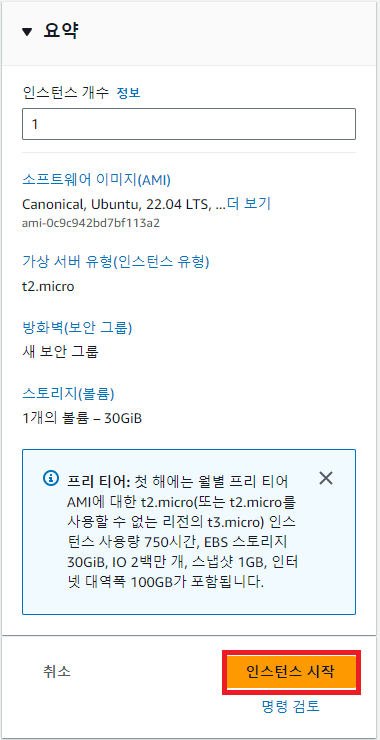 - 요약(Summary)에서 인스턴스 설정을 검토하고 이상 없다면, "인스턴스 시작"버튼을 누른다.