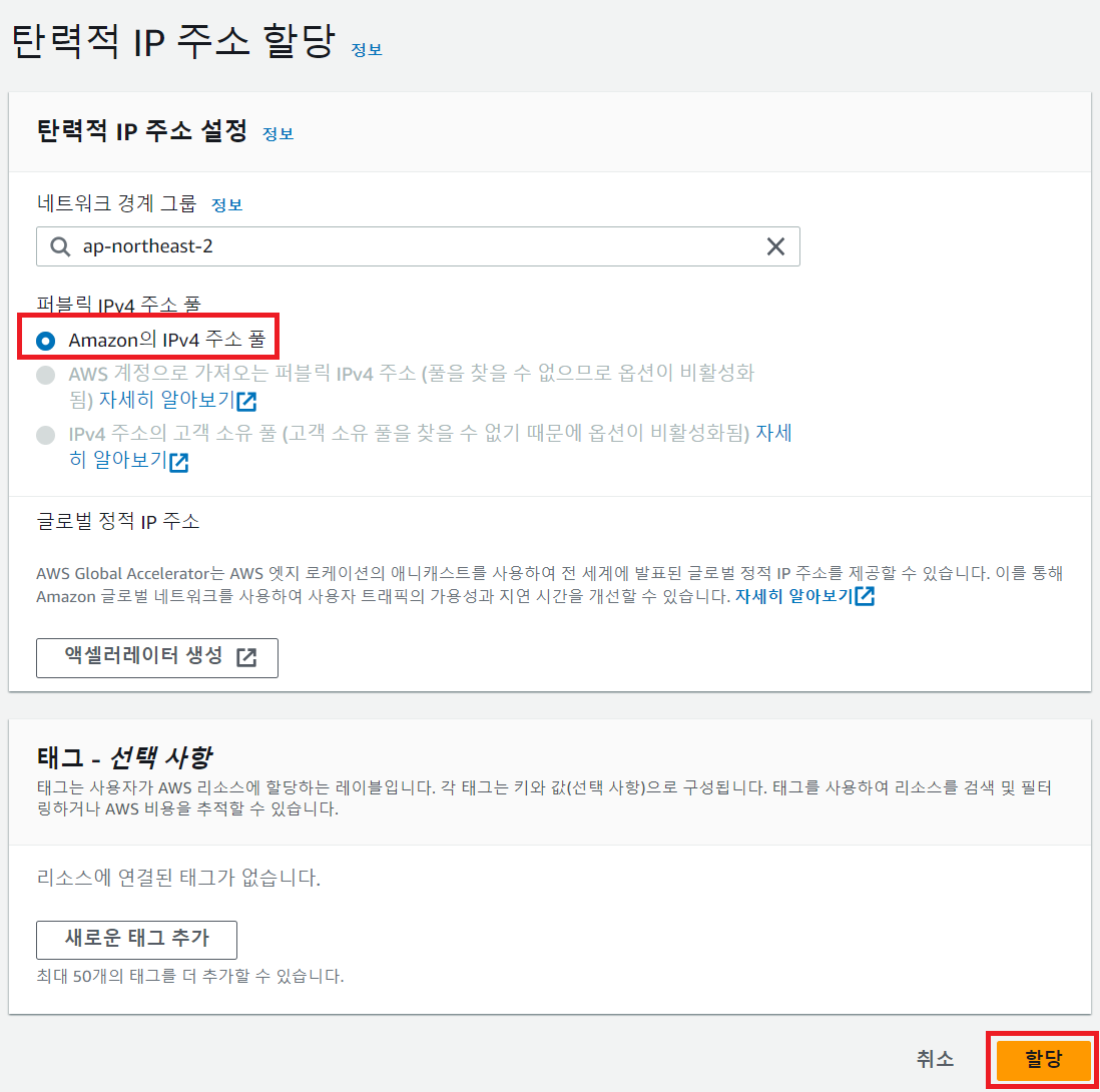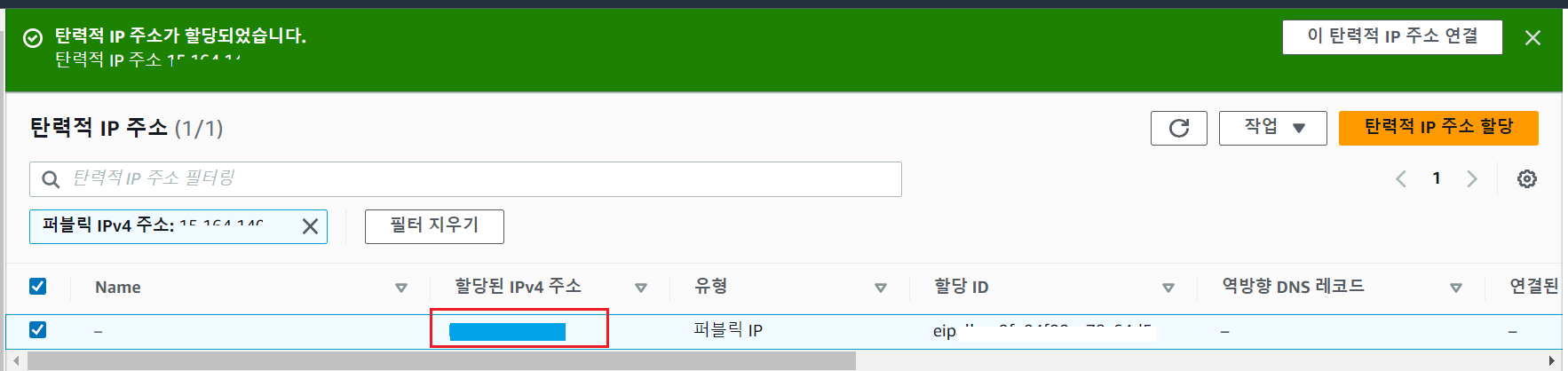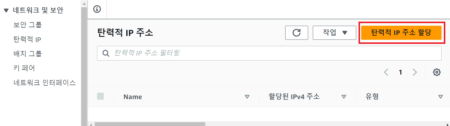 - 우측 위 "탄력적 IP 주소 할당"을 클릭한다.