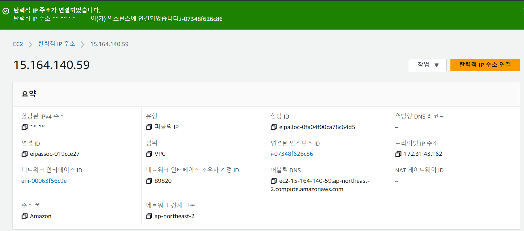 - 다음과 같은 메시지와 함께 탄력적 IP 주소가 인스턴스에 연결된다.