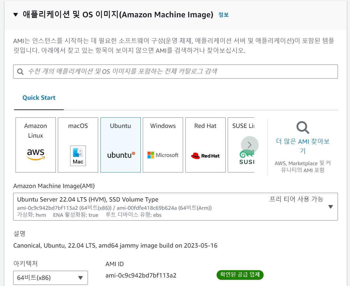 이 중 리눅스 AMI는 아마존이 개발하고 있는 이미지로, AWS의 각종 서비스와 상성이 좋으며 yum이 매우 빠르다.