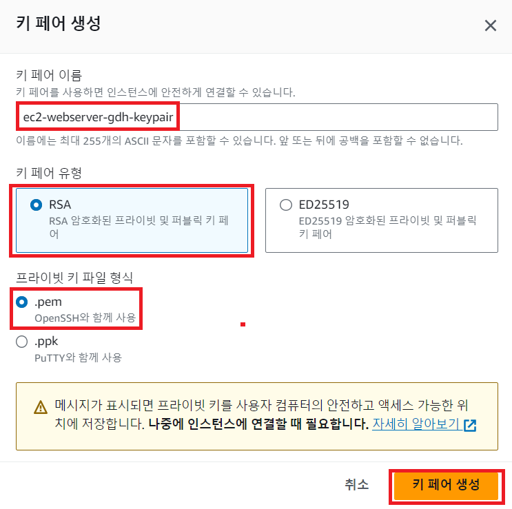 - SSH 방식을 사용할 것이기 때문에 포맷은 pem 확장자를 선택 하였다.