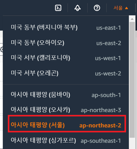 나와 같은 경우 "서울" 리전을 사용할 것이기에 올바르게 선택 되었는지 확인 하였다.