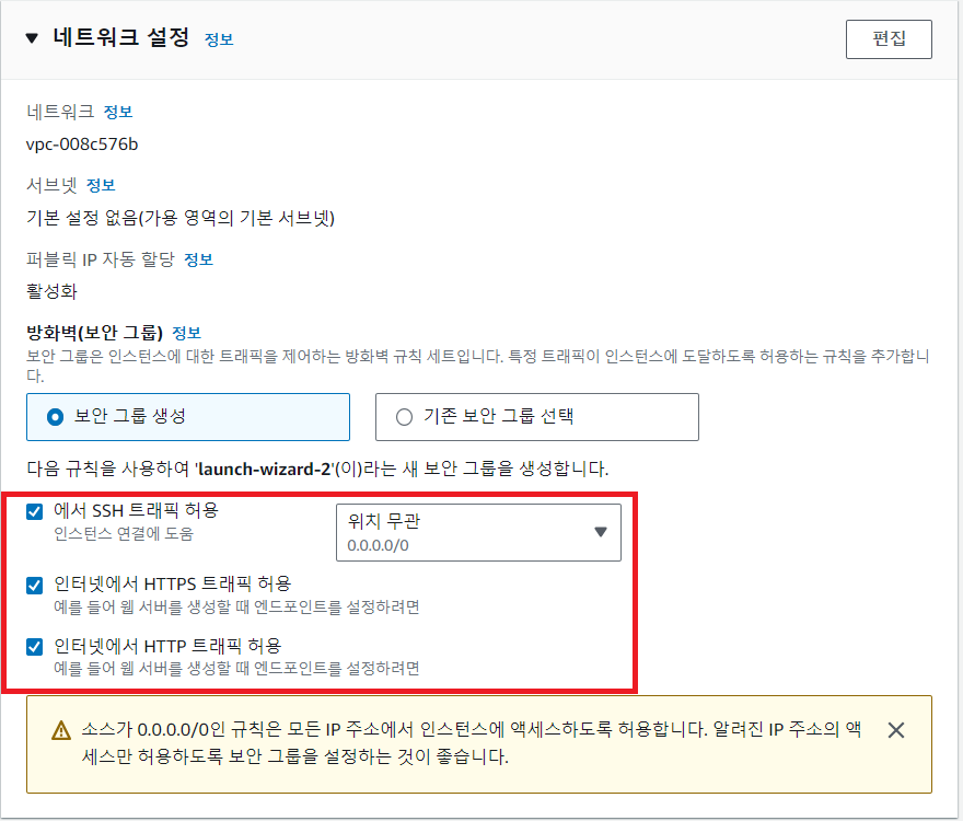 - VPC와 서브넷을 따로 설정하지 않고, 기본 값으로 남겨두자.