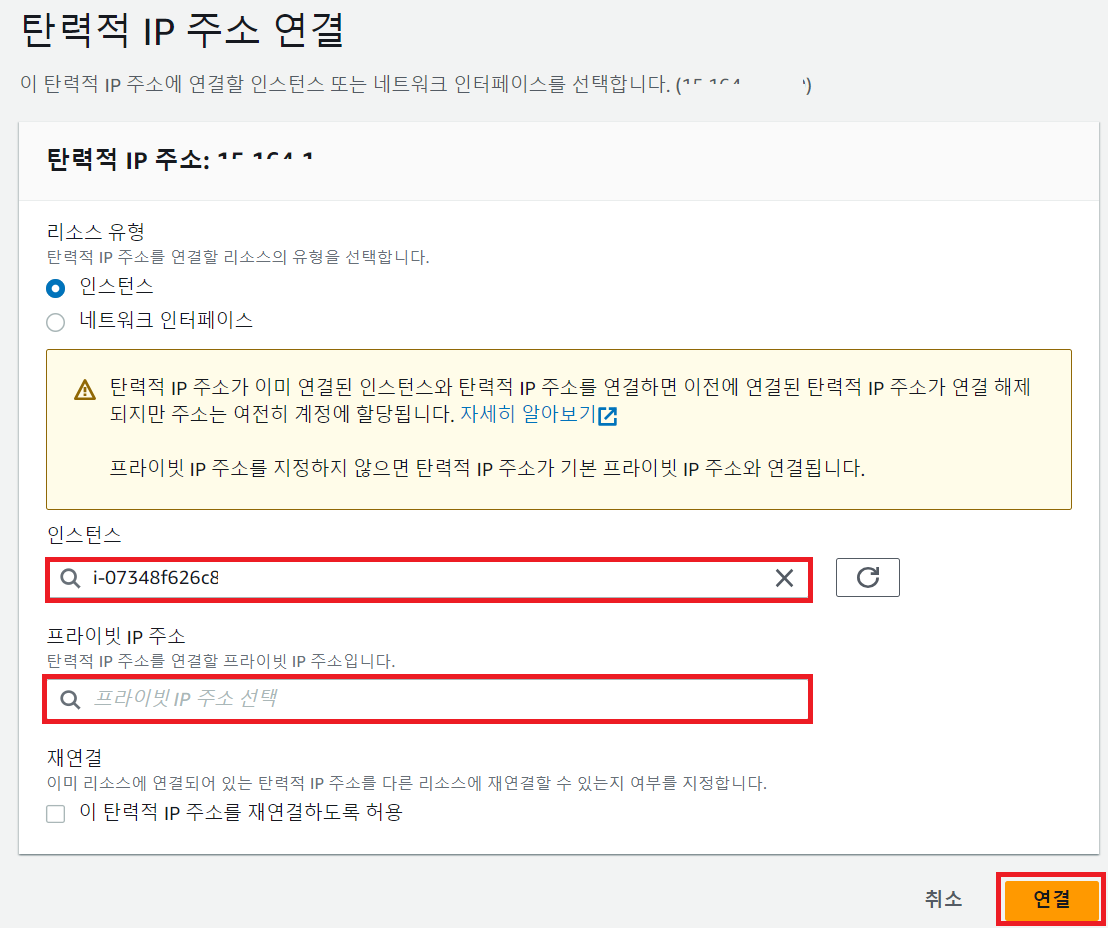 - "탄력적 IP 주소 연결"을 클릭한다.