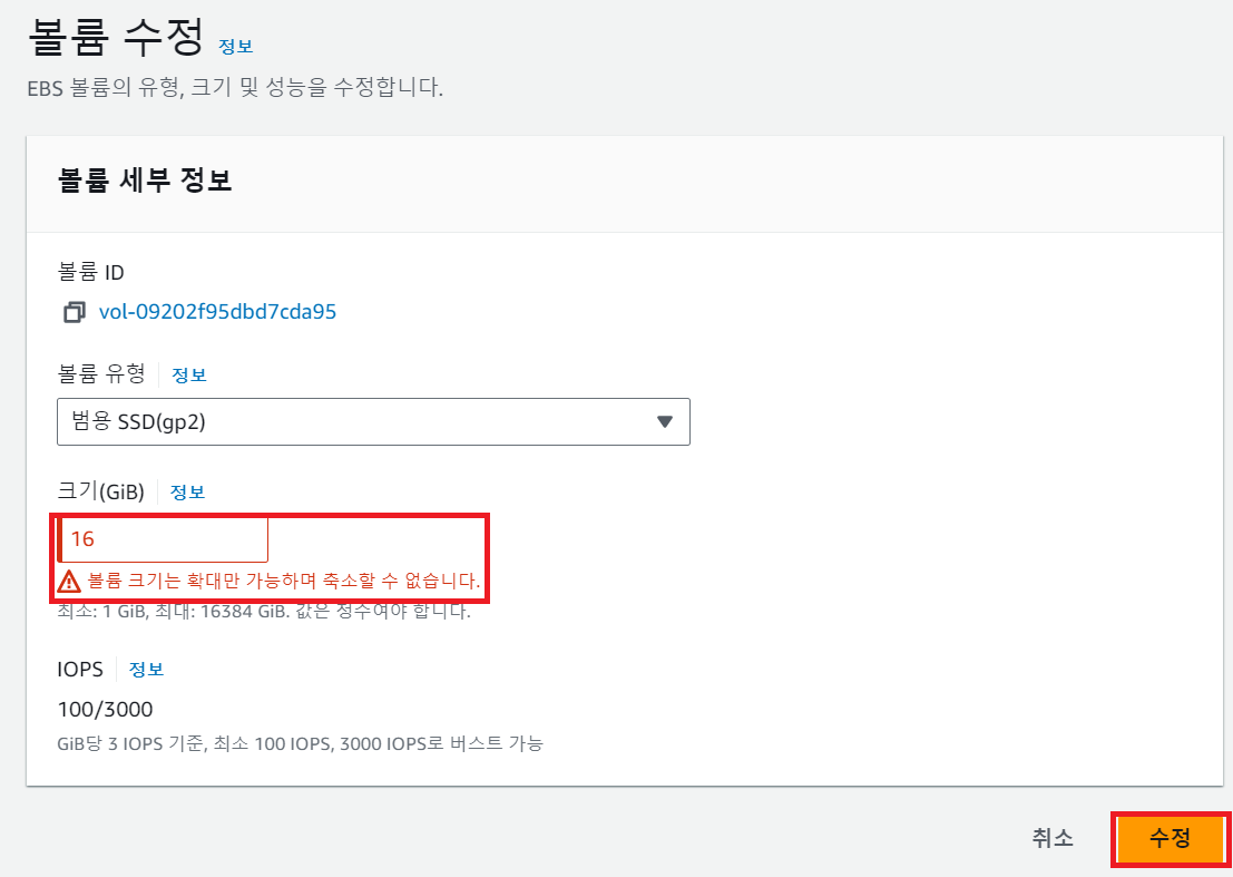 다음과 같이 앞으로 볼륨 수정 시 확장만 가능하기 때문에 나의 경우 기본설정으로 진행 하였다.
