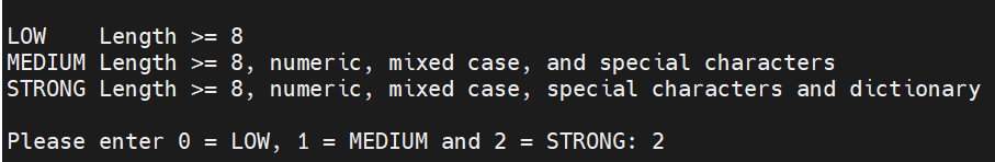 3-2) 암호 유효성 검사 정책에는 낮음, 중간, 강력의 세 가지 수준이 있다. - 나의 경우 강력한 2번을 사용하게 설정 하였다.
