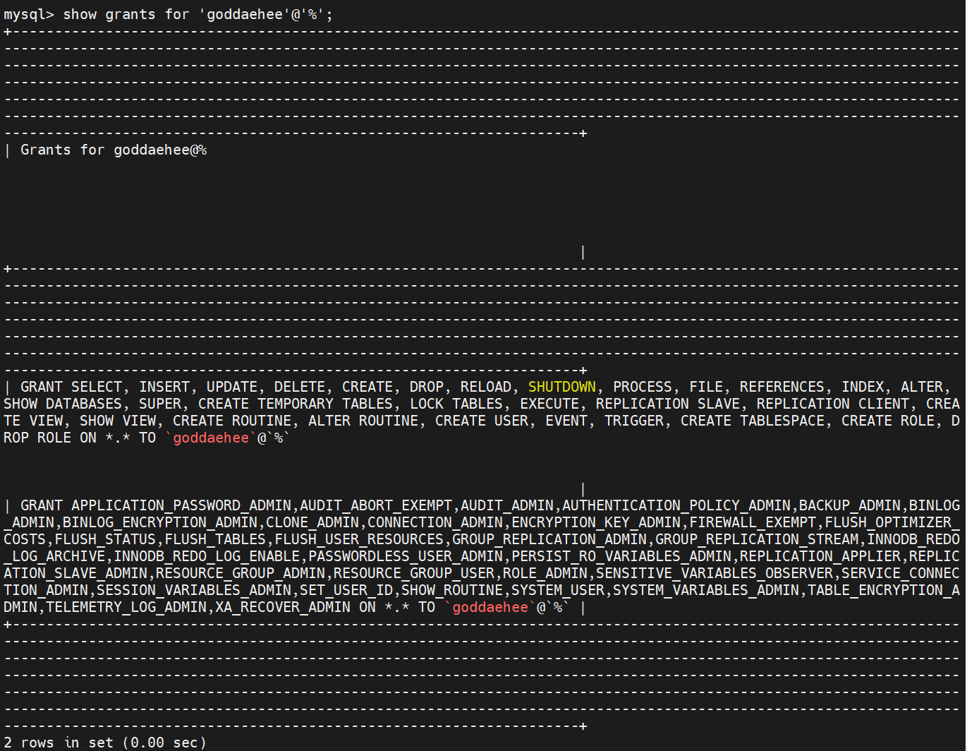 SHOW GRANTS FOR '계정아이디'@'호스트';