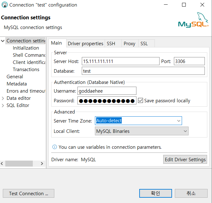 - 나와 같은 경우 하기와 같은 에러 메세지가 확인 되었었다. (설정시 비번 설장하는 부분도 없었다.)