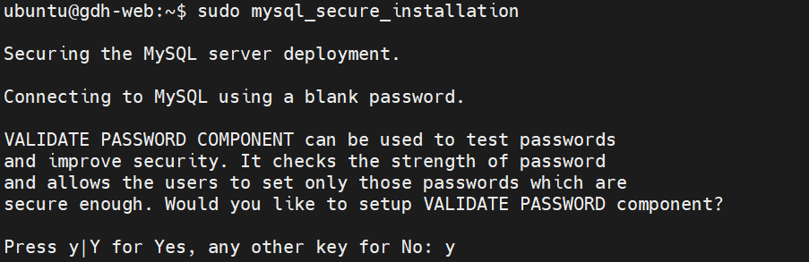 3-1) 사용자의 암호 강도를 테스트, 보안을 향상을 위한 VALIDE PASSWORD PLING을 구성하라는 메시지가 표시된다. 이왕이면 강력한 보안설정을 적용하도록 해보자. y를 누른다.