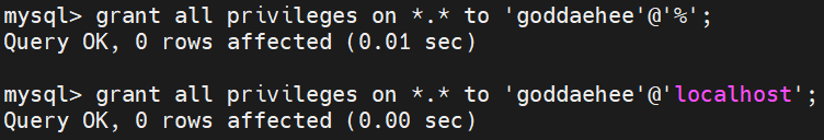 GRANT ALL PRIVILEGES ON *.* TO '계정아이디'@'호스트';