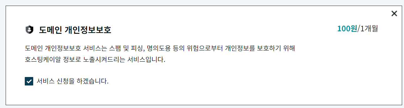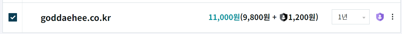 - 간단히 말하면 후이즈같은 도메인 검색시스템으로 조회했을때 소유자의 개인정보를 노출되지않도록 보호해주는 기능으로 볼 수 있는데, 체크해보면 월당 100원씩 1200원이 추가 되는것을 볼 수 있다. 나는 해당 서비스를 이용하기위해 체크 하였다.