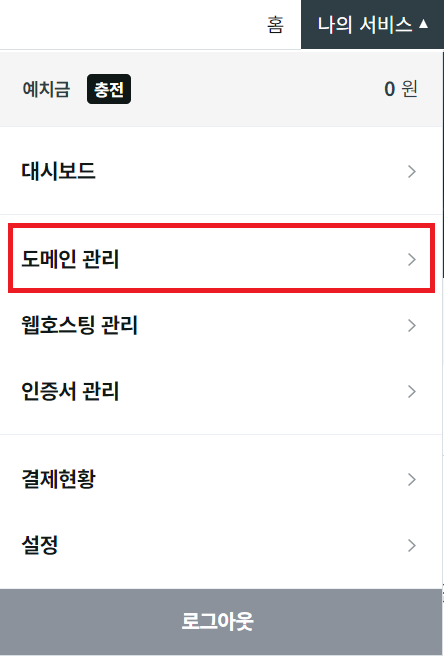 - "메인 화면" > 우측 상단읜 "나의 서비스 > "도메인 관리" 클릭.