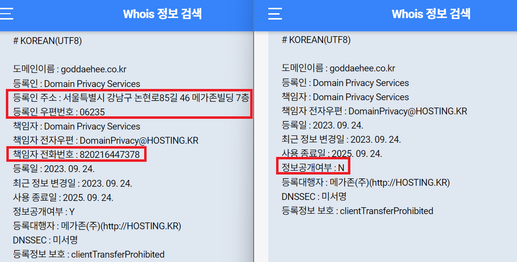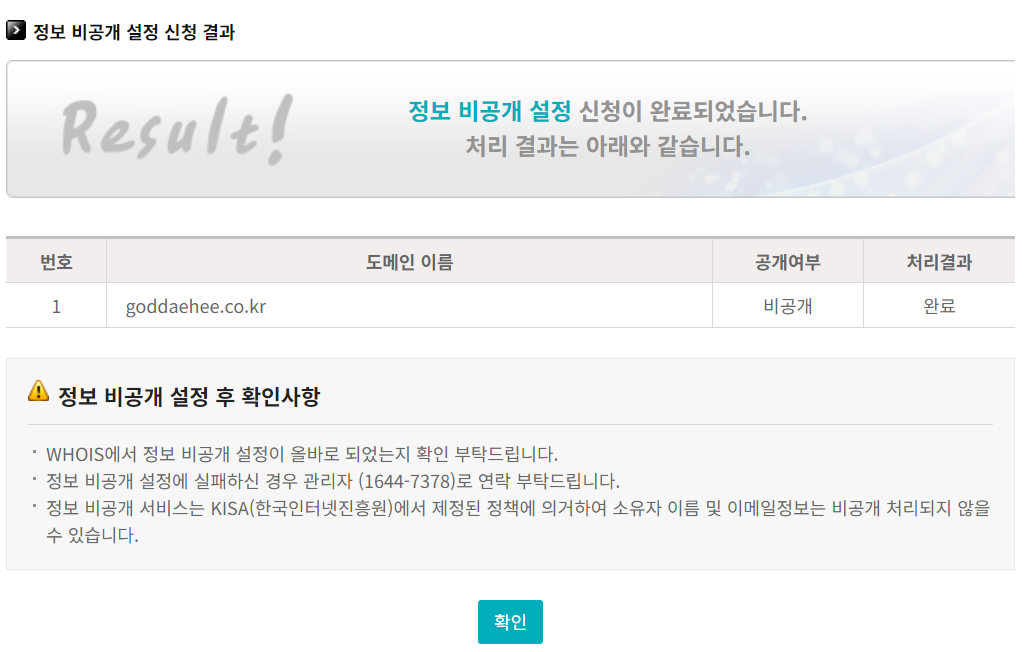 - 후이즈를 통해 확인해보면 내 개인정보는 노출되지 않는 것을 확인할 수 있었다.
