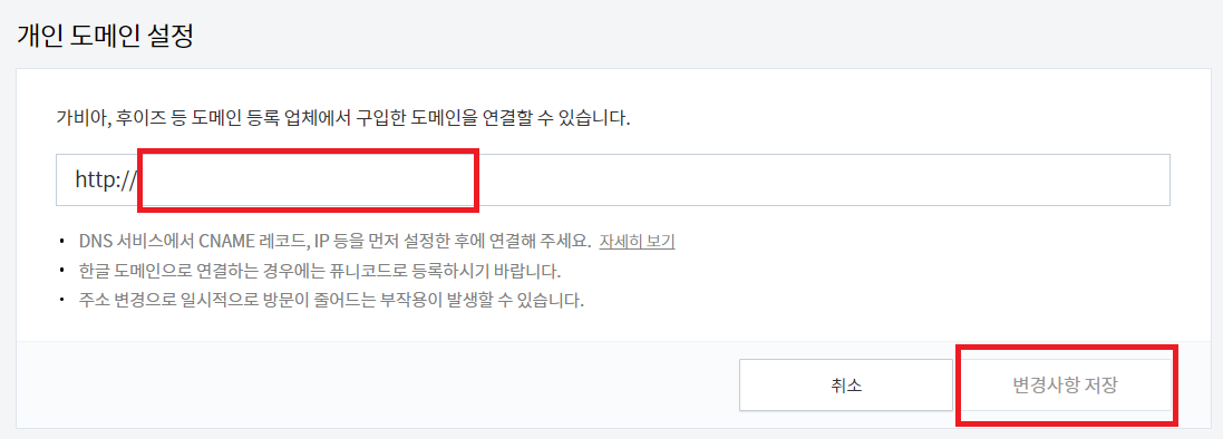 - 본인이 보유 하고 있는 도메인을 입력 > "변경사항 저장"을 클릭하여 준다.