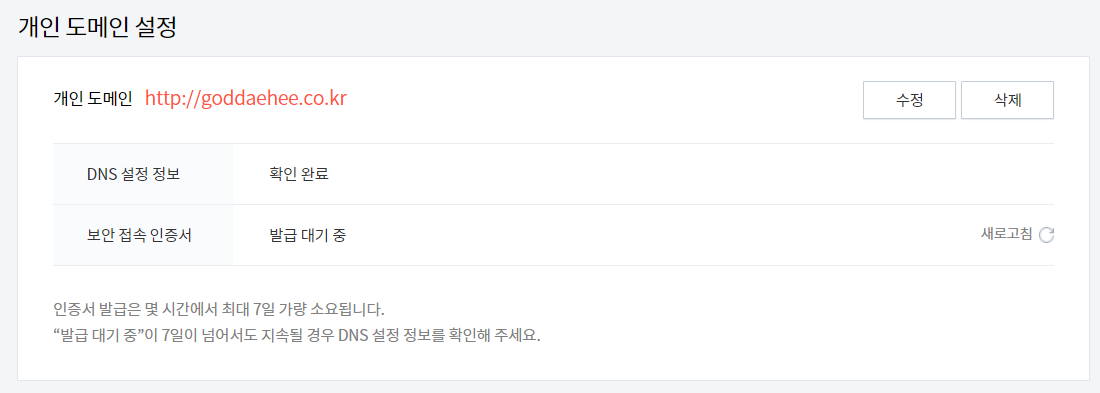 - "보안 접속 인증서"가 발급 대기 중 으로 나오는데, 보통은 1시간 이내에 발급 된다고 한다.
