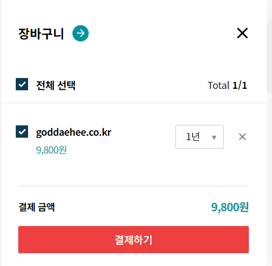 - 사용가능한 도메인과 연간 비용을 확인할 수 있을 것이다. 원하는 도메인을 장바구니에 담는다.