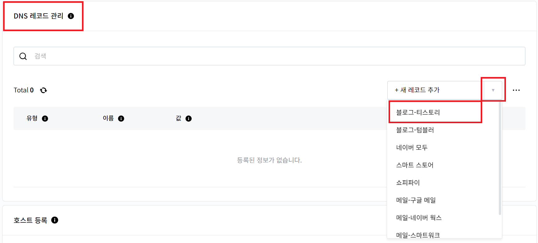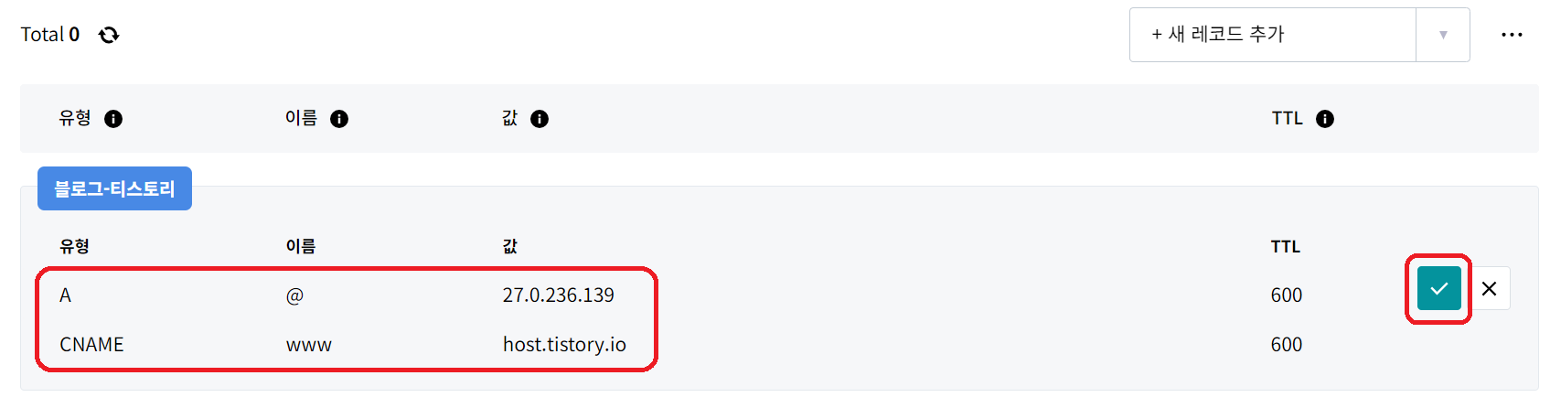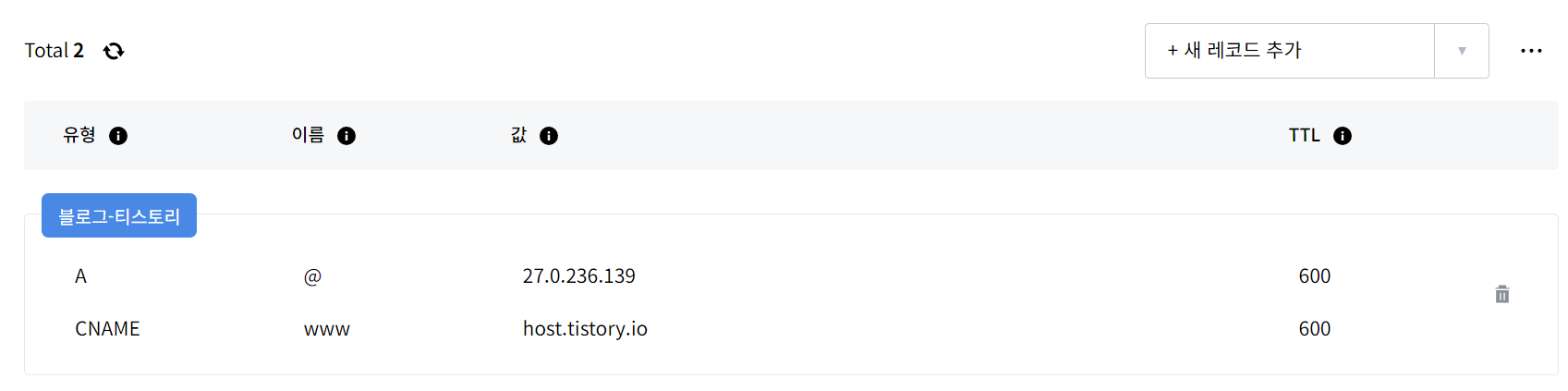 - 우측 하단 "DNS 레코드 관리" > "새 레코드 추가 우측" > "블로그-티스토리" 클릭