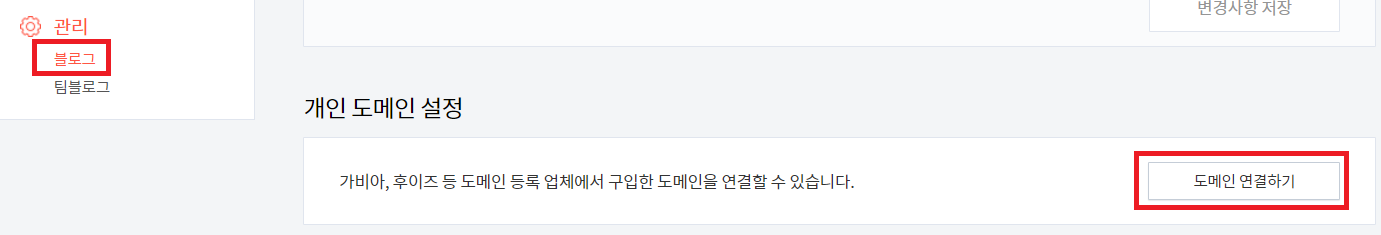 - 관리자 페이지 > 좌측하단의 "관리" > "블로그" > "도메인 연결하기" 를 클릭하여 준다.