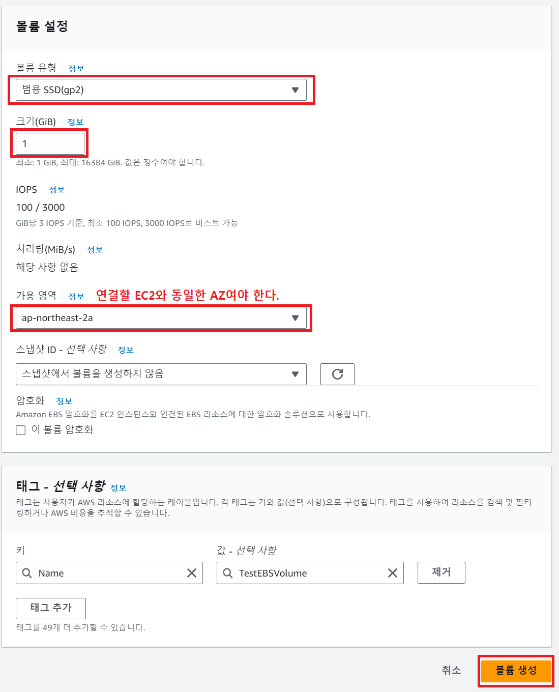 3) 가용 영역 : EC2에 연결할 것이며, 해당 EC2와 동일한 AZ에 위치해야 한다.