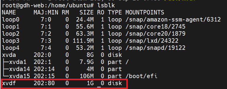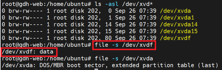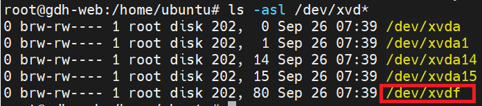 $ ls -asl /dev/xvd* # 연결된 디렉토리 조회