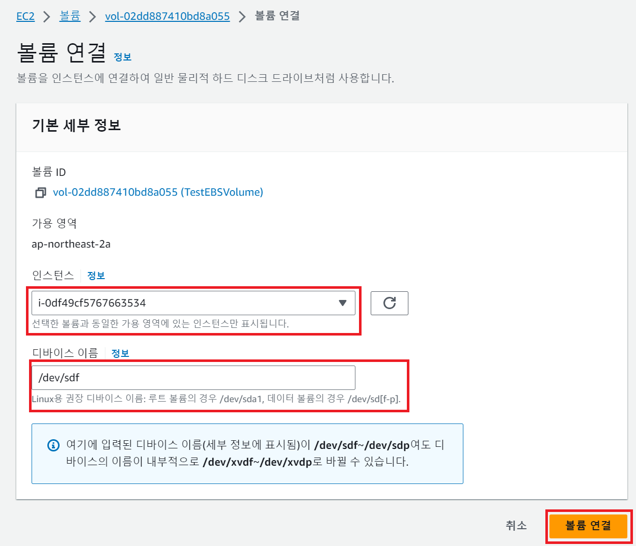 - 연결할 인스턴스 선택 > 디바이스 이름은 default로 설정 하였다.