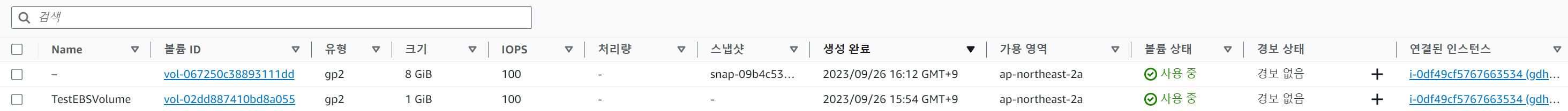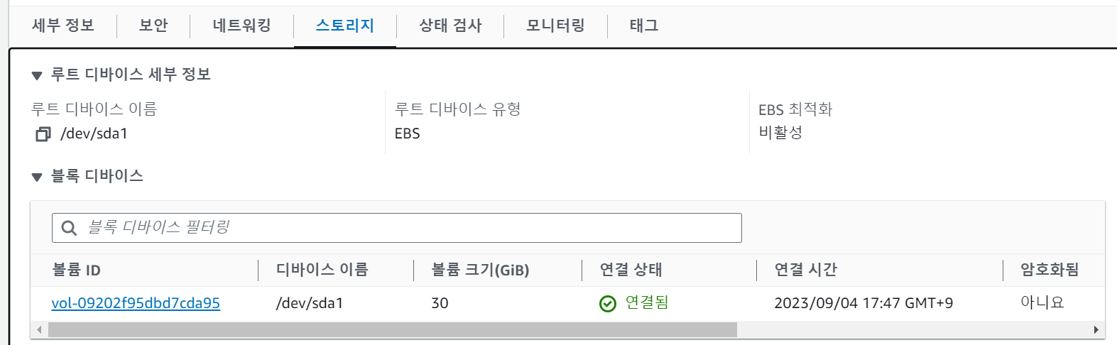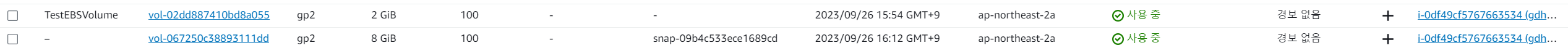 - 최종적으로 동잃나 EC2 인스턴스에 2개의 볼륨이 장착 되어있는 것을 볼 수 있다.