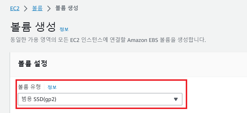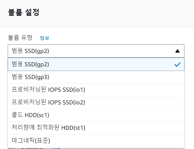 1) 볼륨 유형 : 기본인 gp2를 사용할 것 이다.