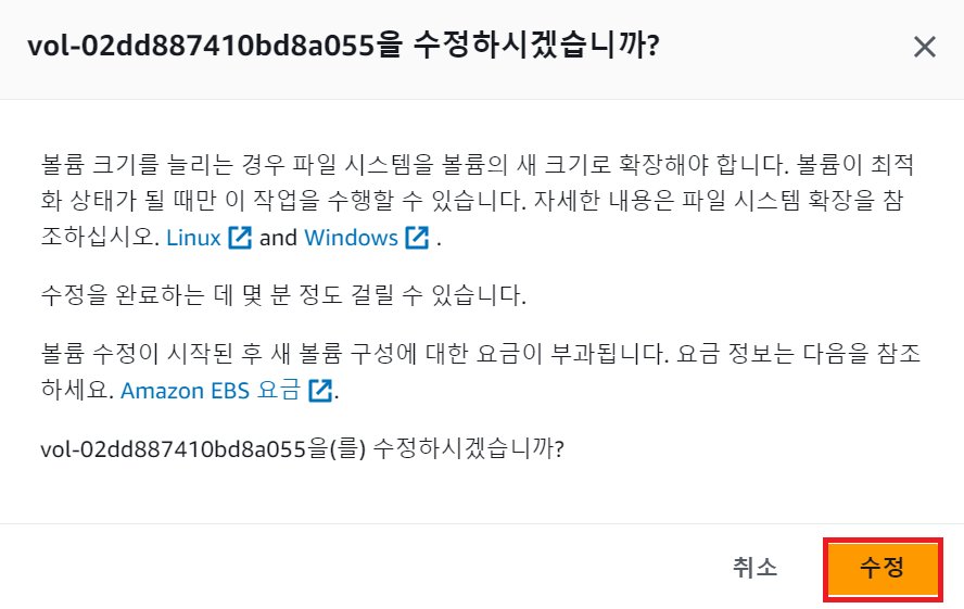 - "볼륨" > "확장할 볼륨 체크" > "볼륨 수정"