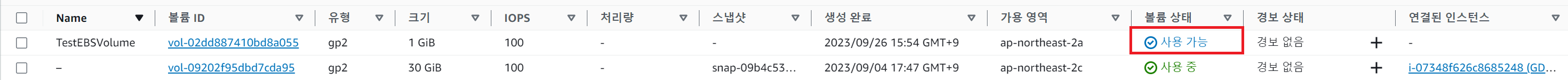 - 연결 완료 후 "볼륨 상태" 및 "연결된 인스턴스"를 확인 해 본다. 정상적으로 연결 되었다.