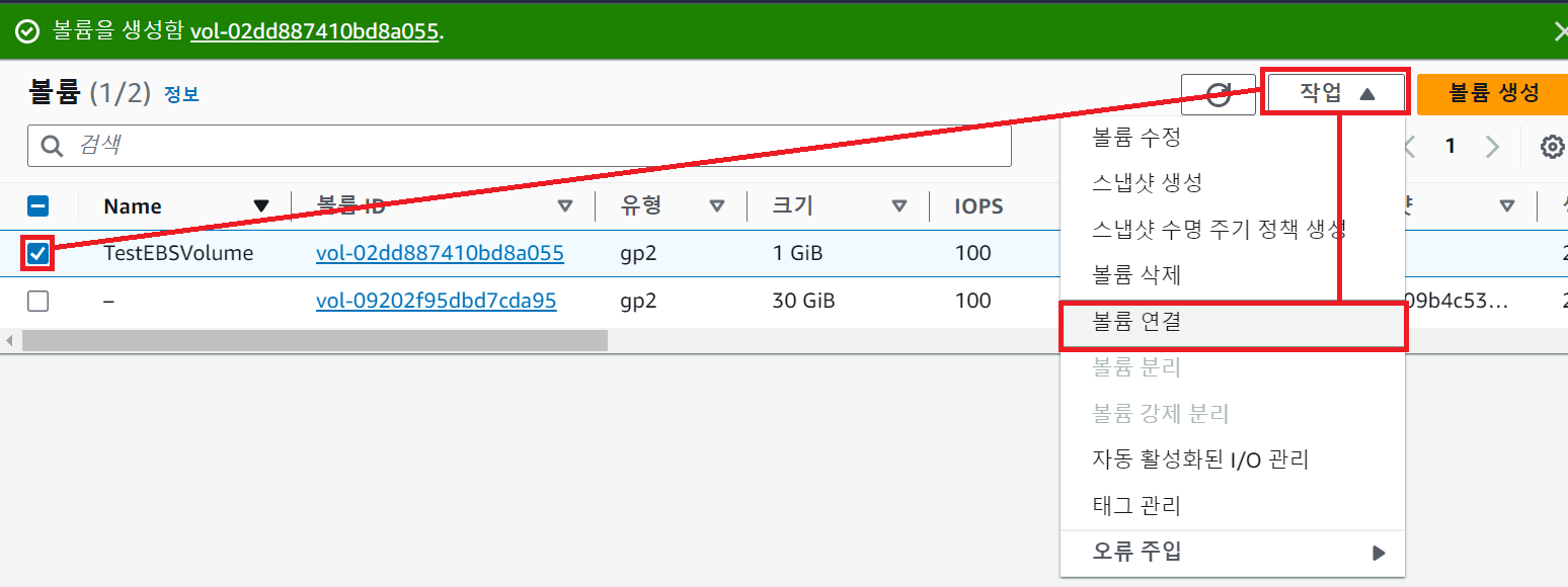- 생성된 볼륨 체크 > "작업" 클릭 > "볼륨 연결" 클릭
