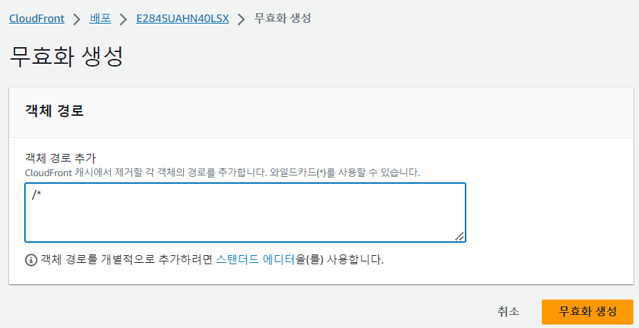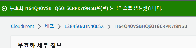 - 현재는 index.html 파일 1개 밖에 없기 때문에 /index.html을 입력해도 되고, /*을 입력 해도 된다. 입력 후 "무효화 생성" 클릭.