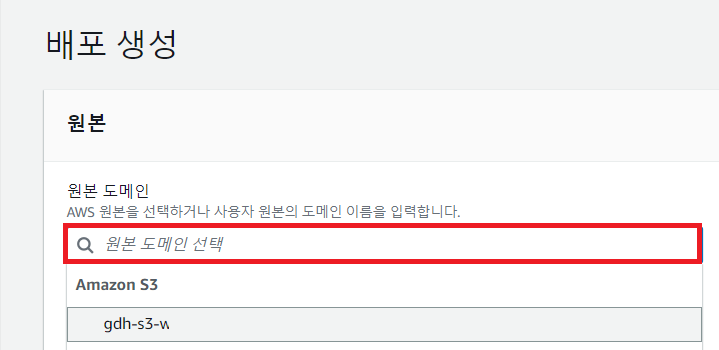 - 원본 도메인(Origin Domain) 선택 : 위에서 설정해준 S3 버킷을 선택 하여 주자.