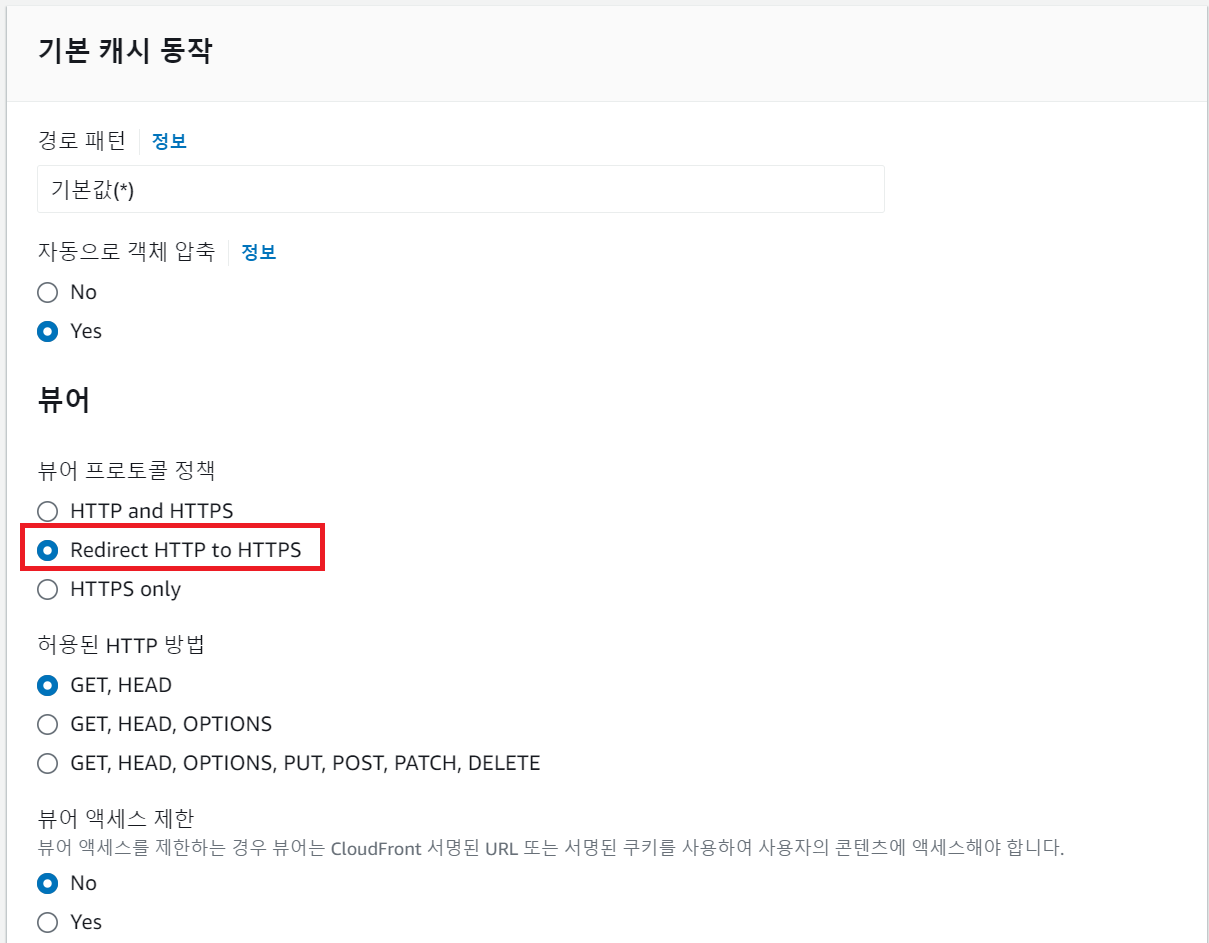 - 나는 http로 요청오는 것도 https로 전환하고자 하여, 뷰어 프로토콜 정책을 "Redirect HTTP to HTTPS"로 체크 하였다.