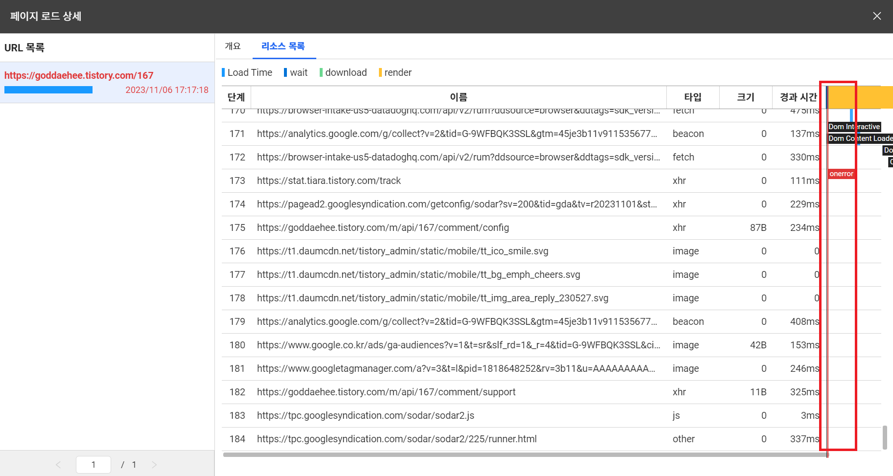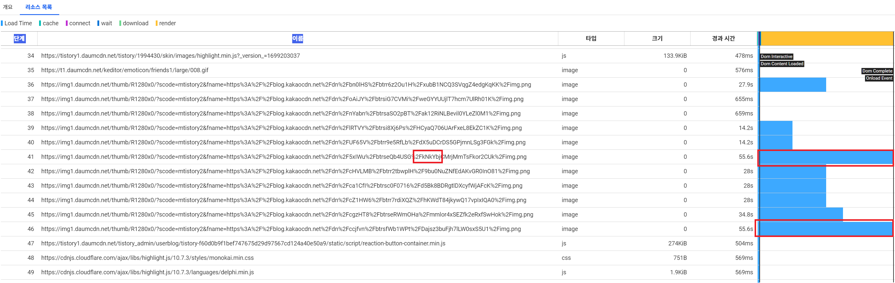 - "리스소 목록" 탭을 클릭하여 실제 리소스별로 소요 시간을 확인할 수 있다.