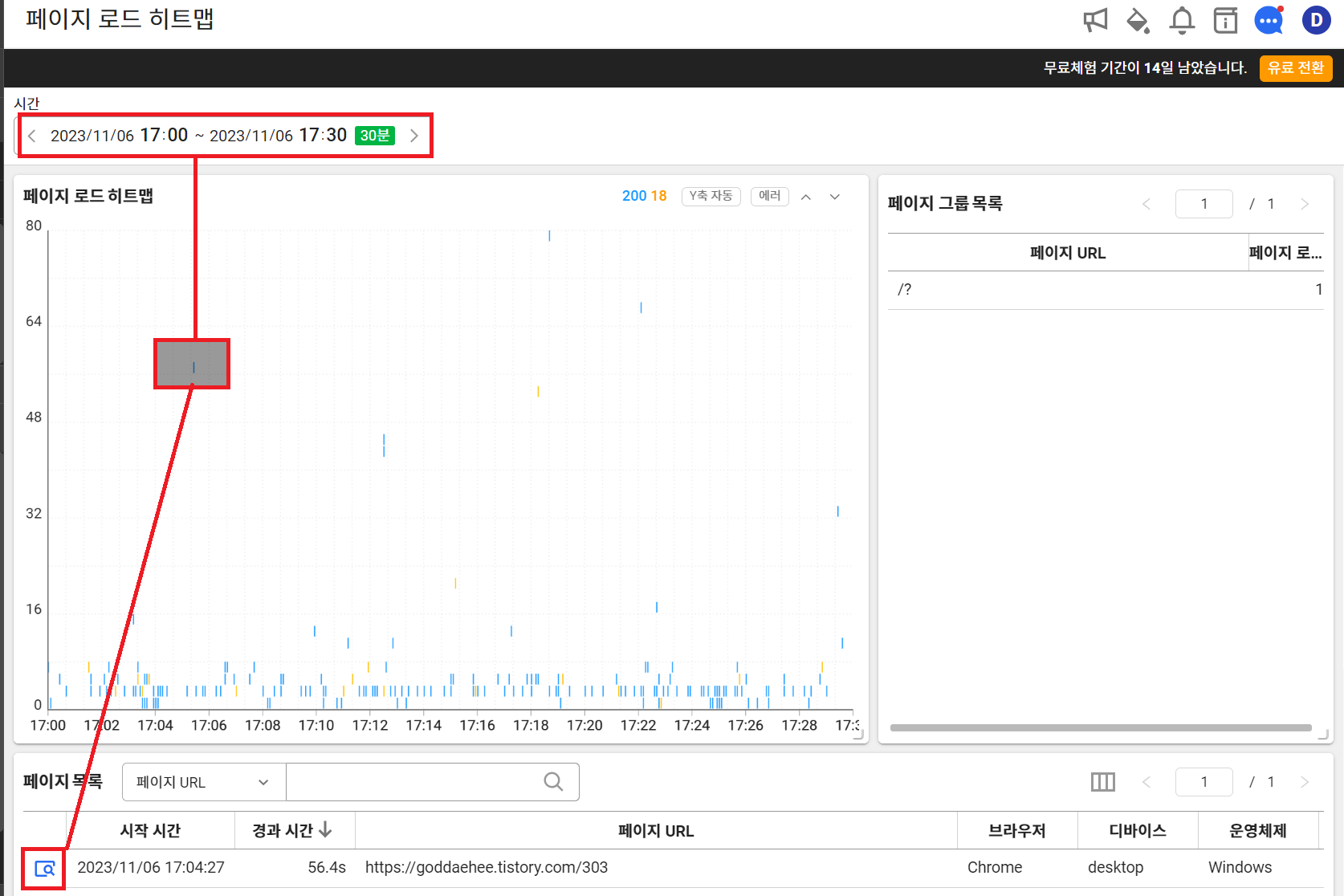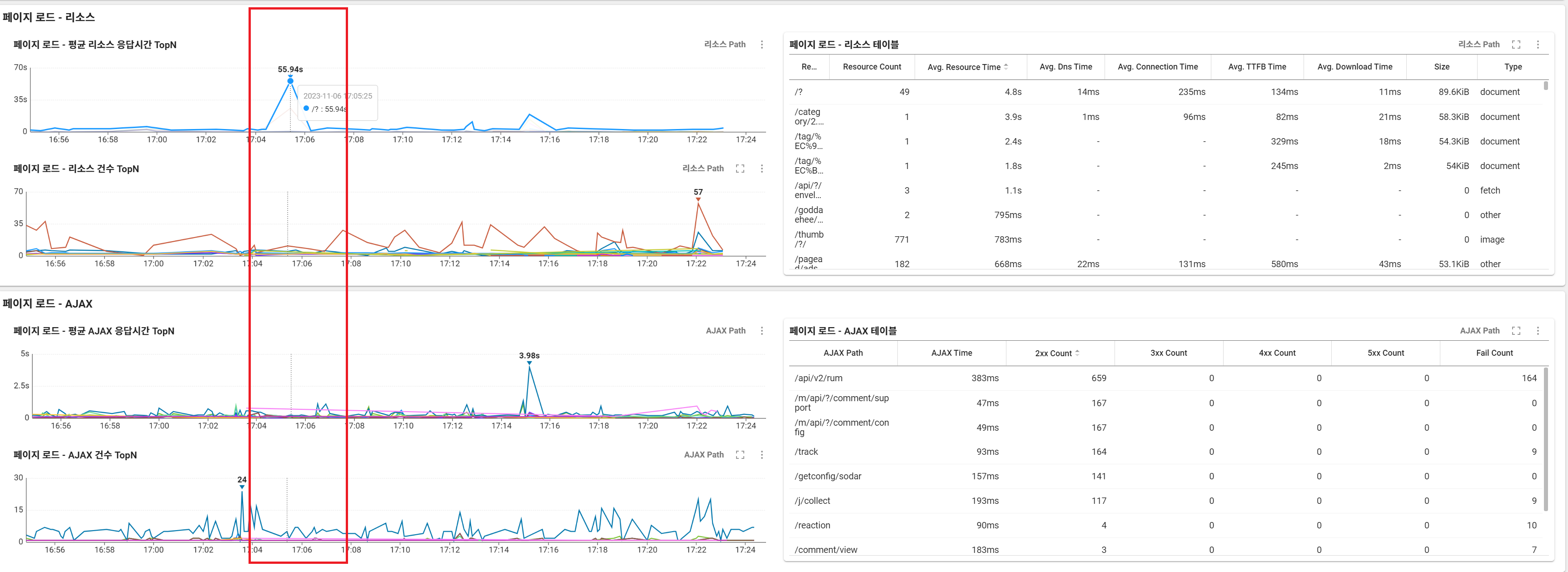 ex) 해당 메뉴를 통해 이전 17:05분경 왜 페이지 로드가 오래걸렸는지에 대한 분석을 해보자.