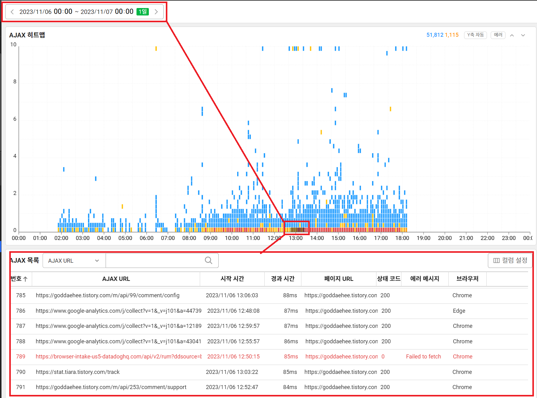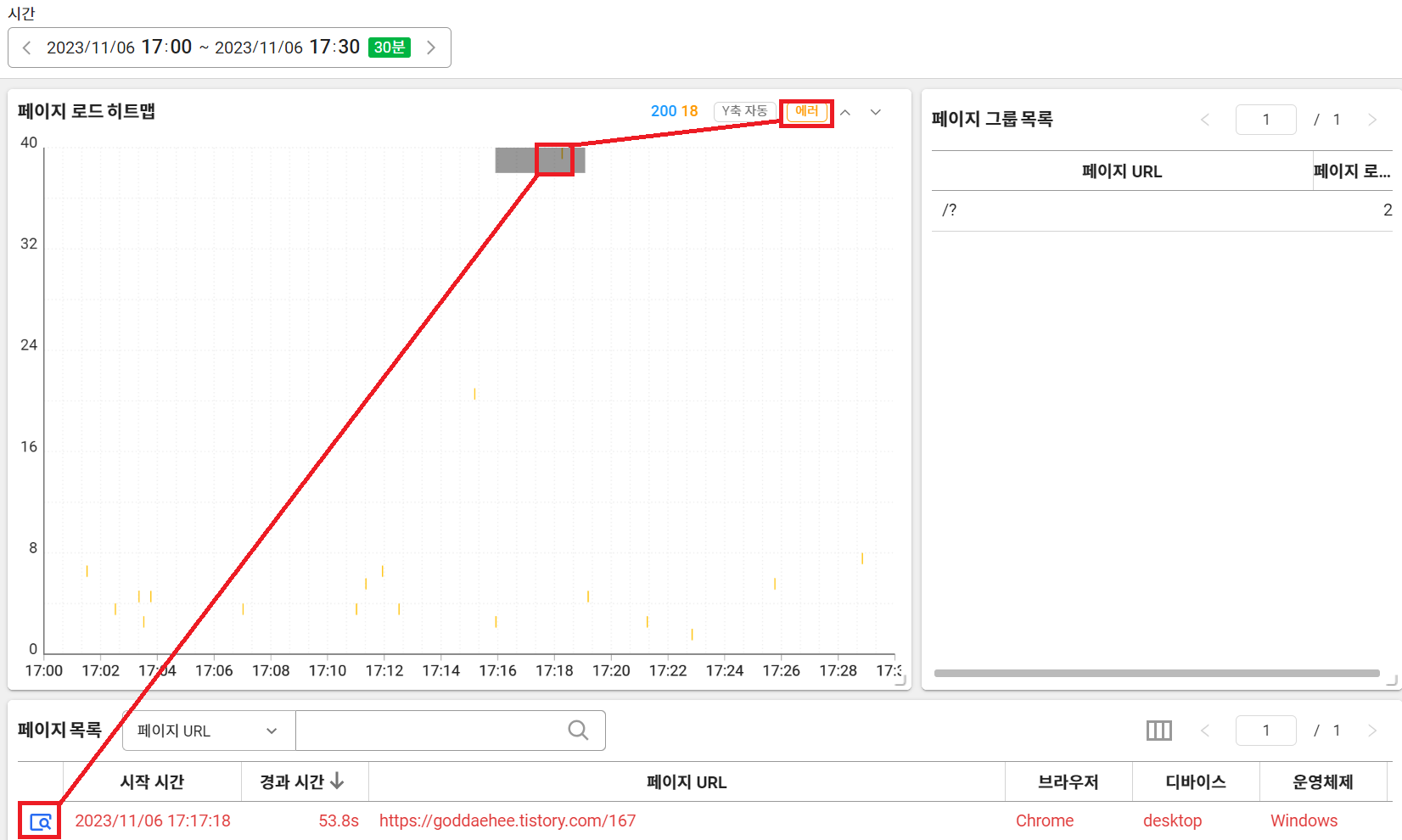 - "히트맵"에서는 에러만 필터링 할 수 있다. 상세 페이지를 확인해보자.