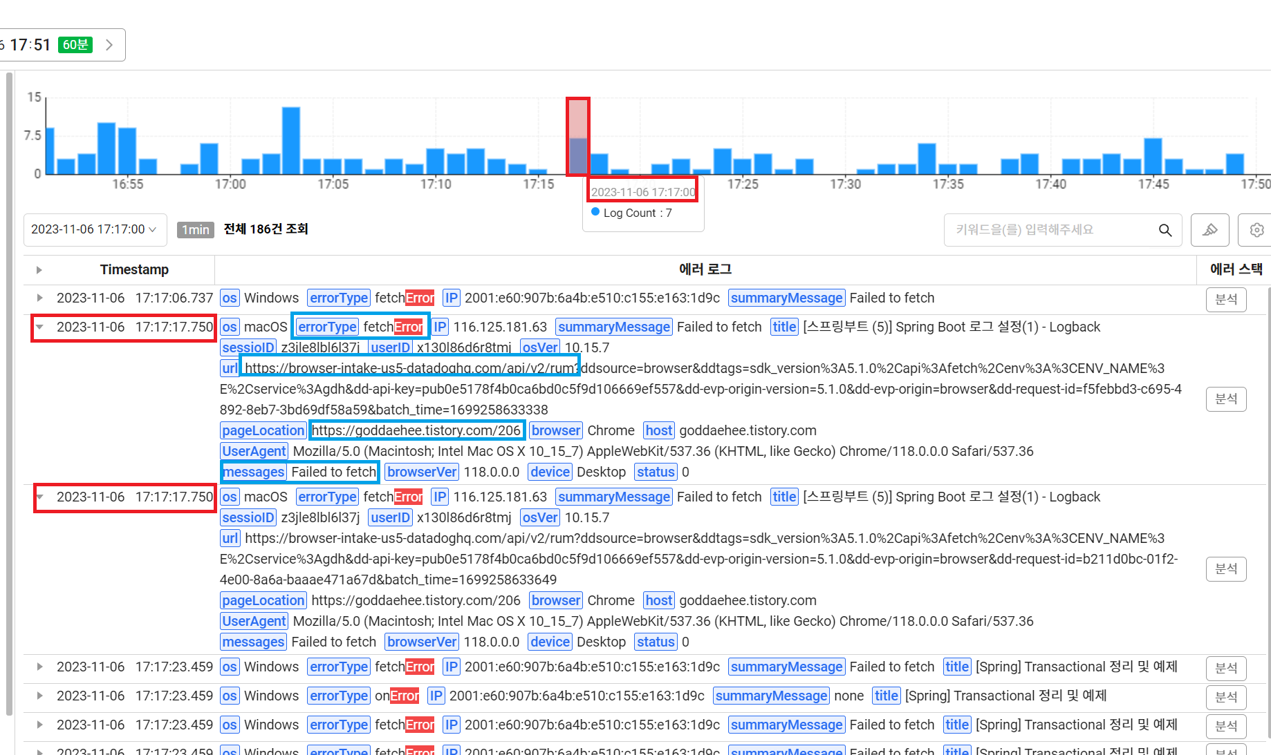 ex) 위의 오류는 17:17분 18초경 발생 하였다. 해당 시간대의 에러만 필터 해보자.