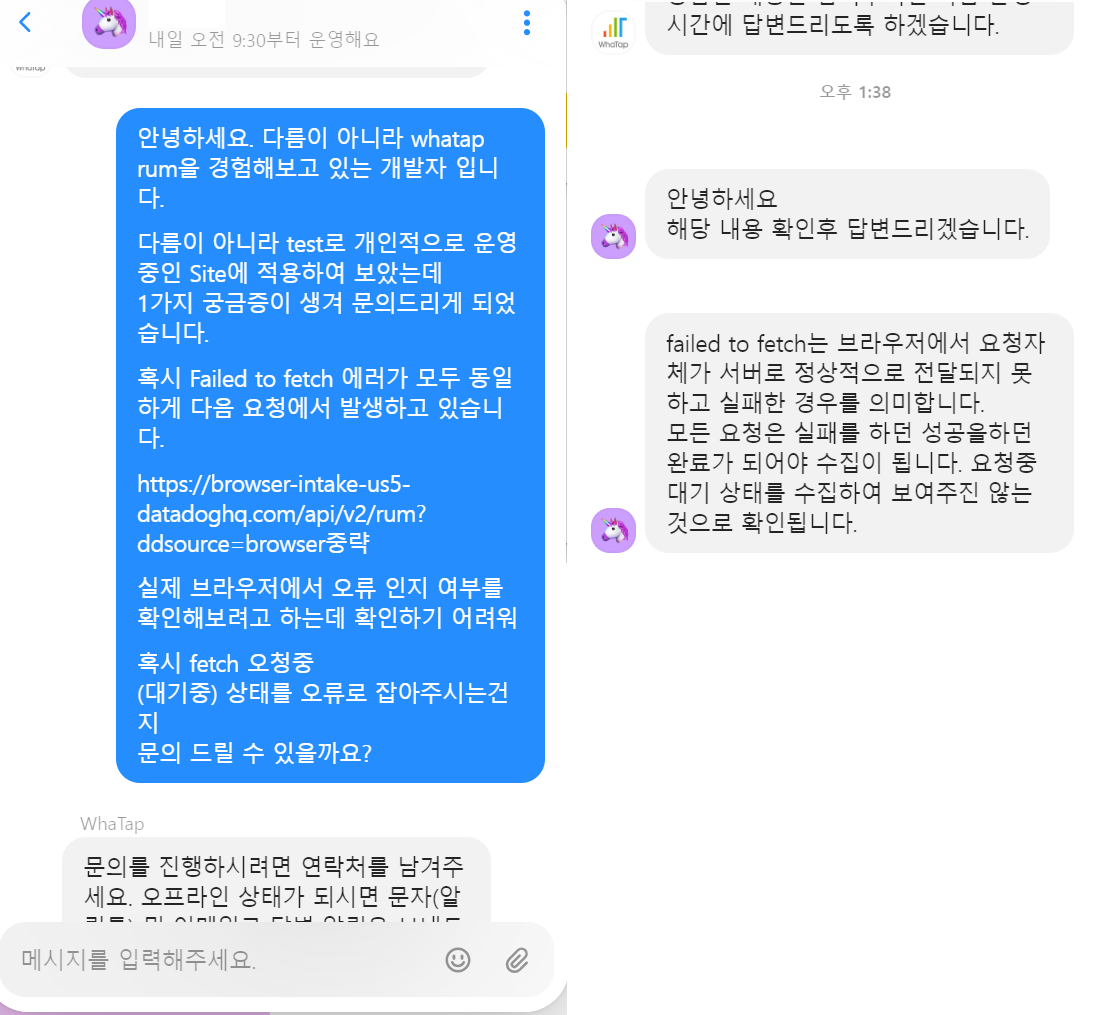 (ex2, 동일한 fetch 에러를 발생 시켰을때 비교시 에러 추적을 위한 정보가 부족하며, 아직은 whatap은 실제 1명의 고객 session 동선 기준으로 추적이 불가능 하다는 점. )