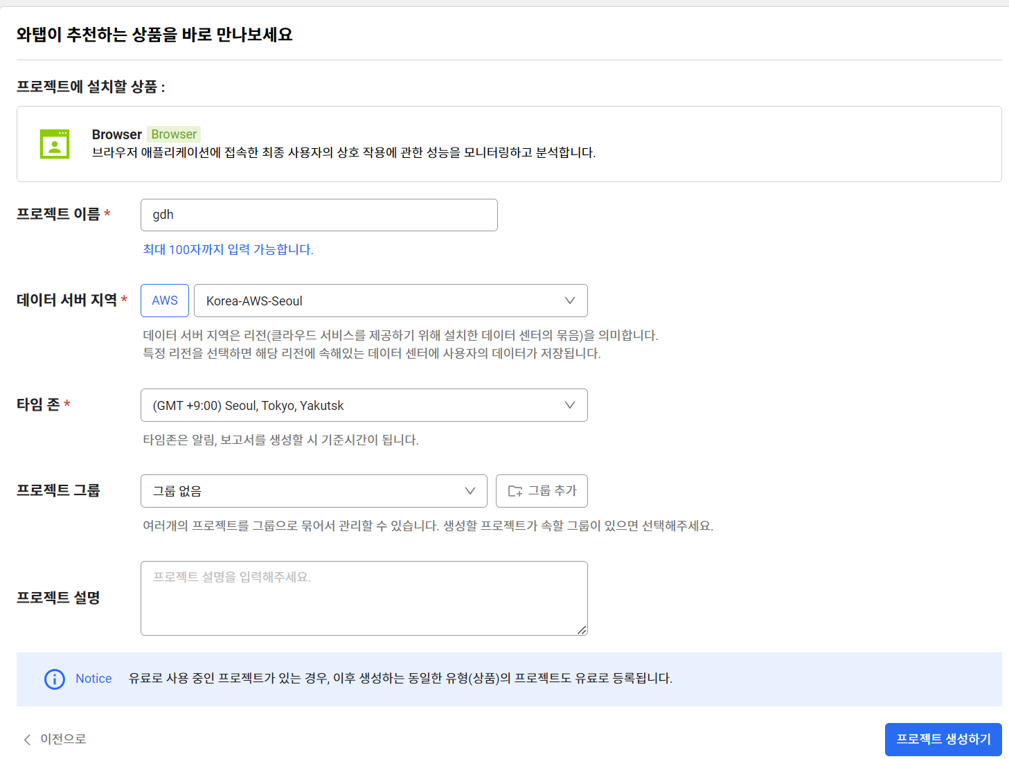 - 프로젝트 이름, 지역, 타임존 등만 설정하면 된다.