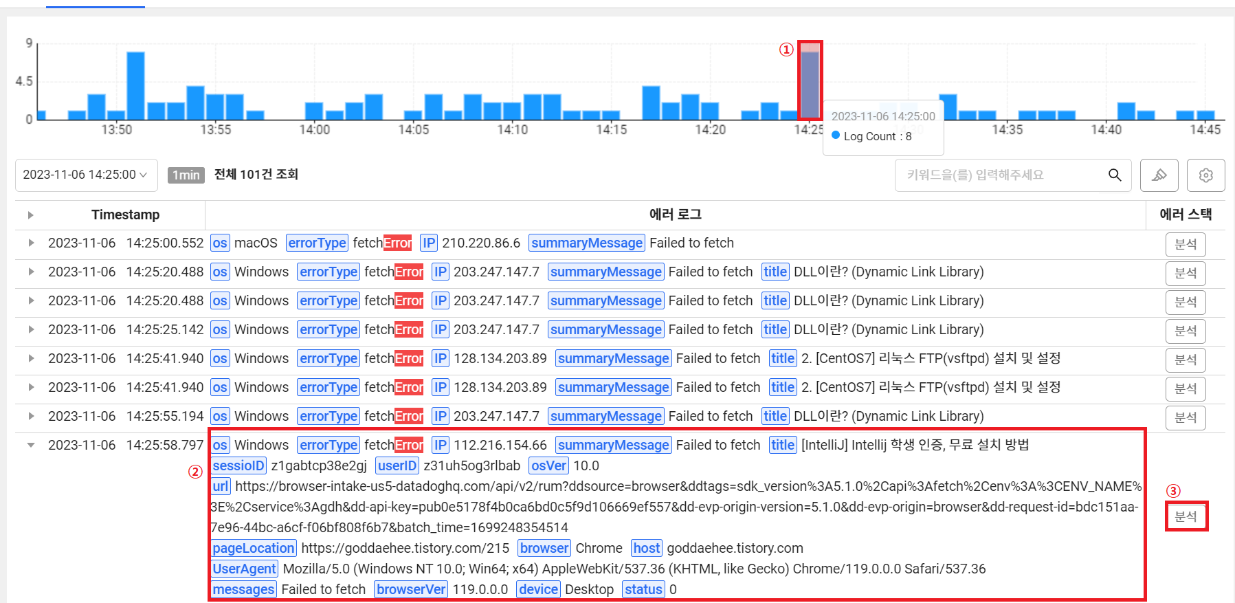 ① 특정 구간으로 구분되어있으며 선택시 해당 시간대의 에러리스트를 하기에 보여 준다.