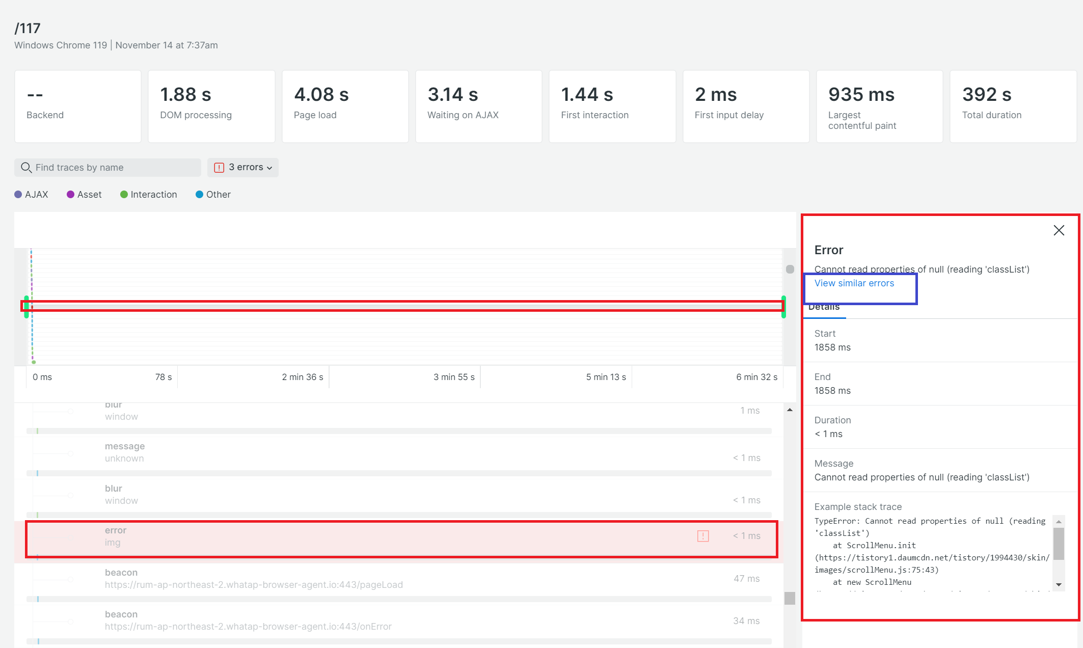 - 상기 화면의 "View similar errors "를 클릭 하면 해당 에러를 특정 기간 에러 상세 페이지로 넘어가게 된다. 상세 페이지는 따로 살펴보자.
